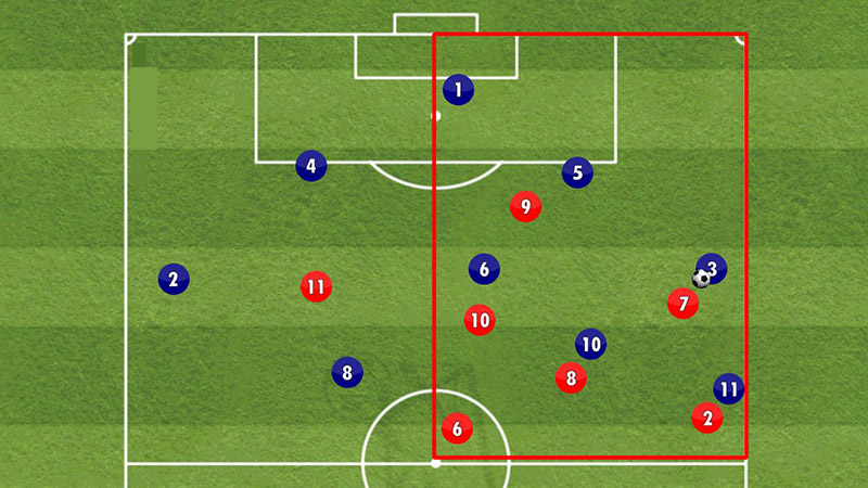 Đội hình sẽ di chuyển như một khối thống nhất để đẩy đối thủ vào các “vùng chết” trên sân, thường là sát đường biên hoặc góc sân. Khi không gian chơi bóng bị thu hẹp lại tối đa, đối thủ sẽ tự rơi vào trạng thái bế tắc và buộc phải trả lại quyền kiểm soát bóng.
